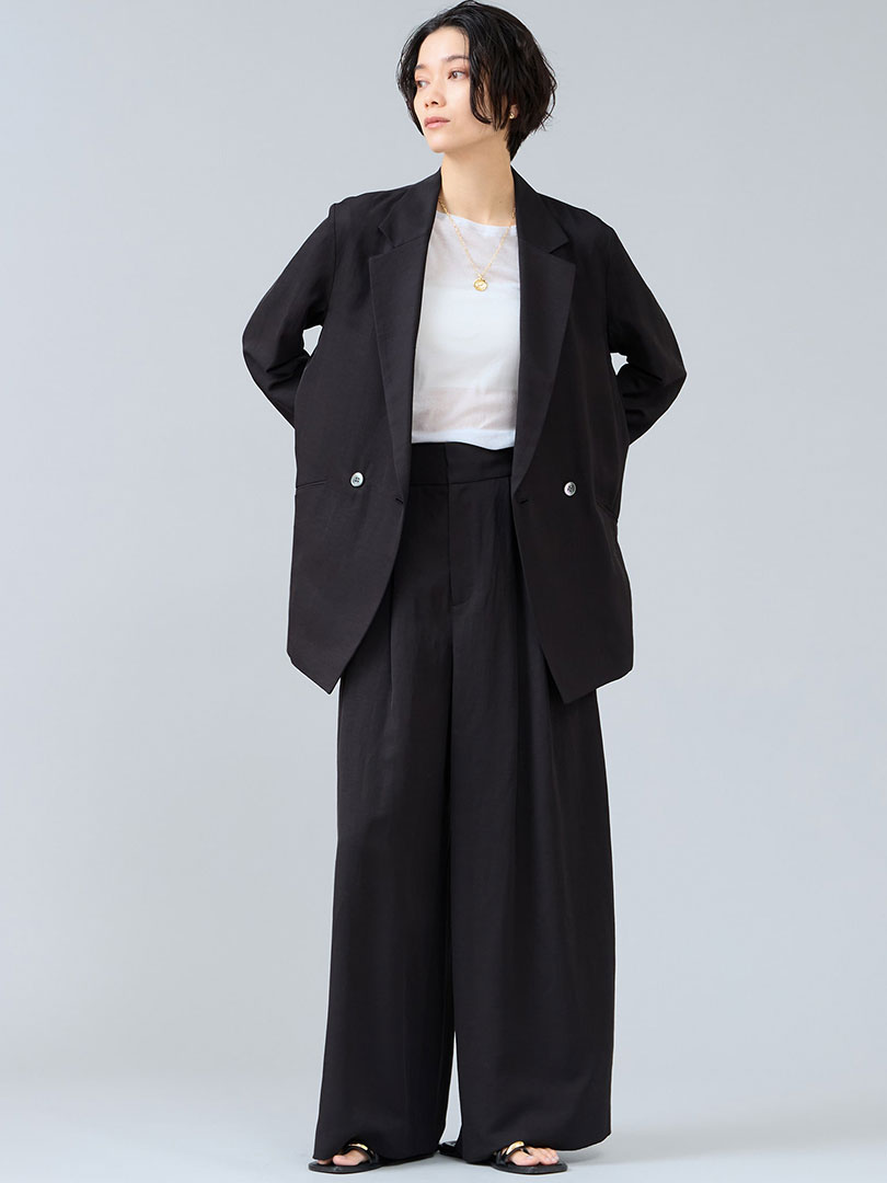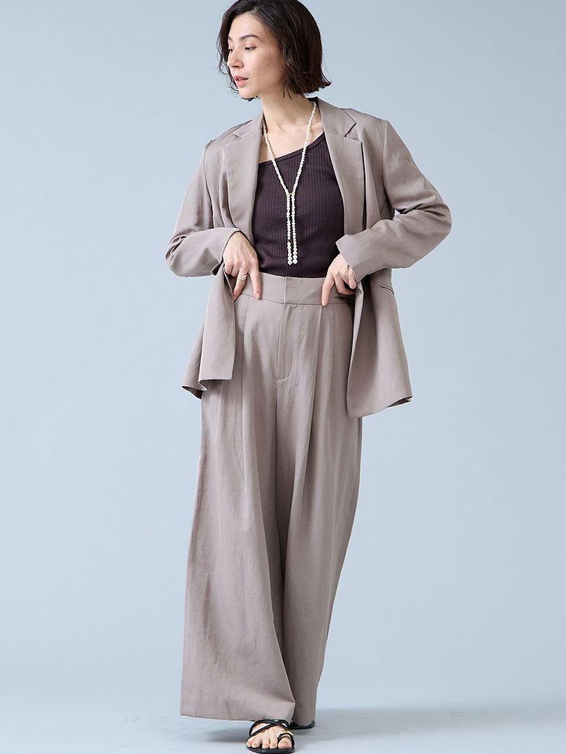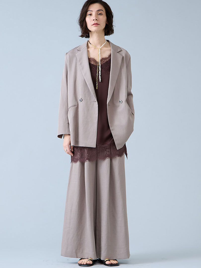 まるでシルクのような上品な光沢と、リネンのネップが程よいこなれ感が魅力の素材。 軽やかなのに透けにくく、シワになりにくいイージーケア仕様で、デイリーにも取り入れやすいのがポイントです。インナーにはデコルテを綺麗に魅せるカットソーや、トレンドのレースを覗かせて。リエスらしいリラックス感のあるジャケットとパンツが気張らないコーディネートを作ります。