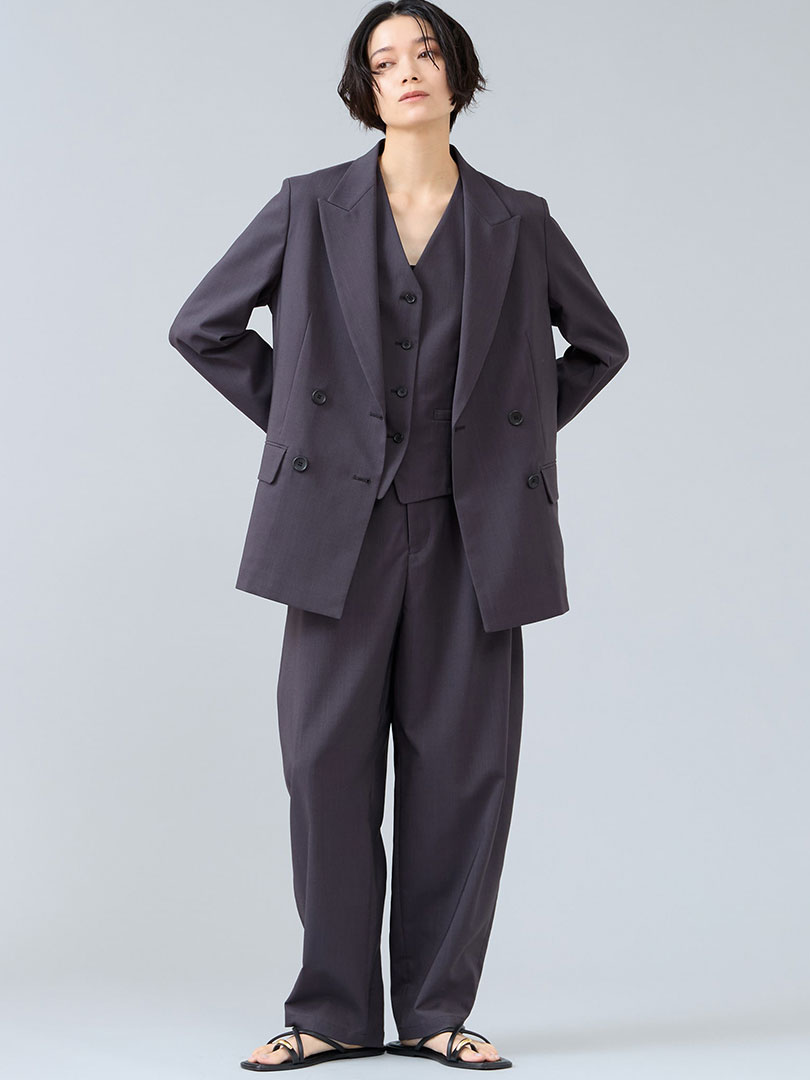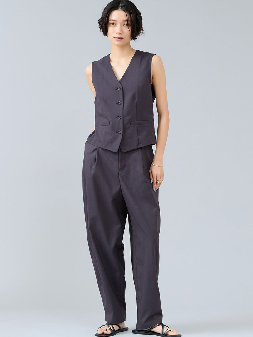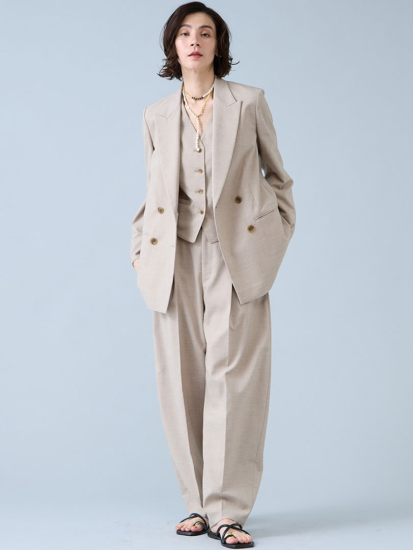 3ピース楽しめるセットアップはこなれ感抜群。ジレ×パンツやジャケット×ジレ・ジャケット×パンツなど様々な着こなしを楽しめます。春夏のリエスで人気の麻見え素材は洗えてしわになりにくく日常に寄り添えるアイテム。旬のスタイリングが完成するアイテムです。