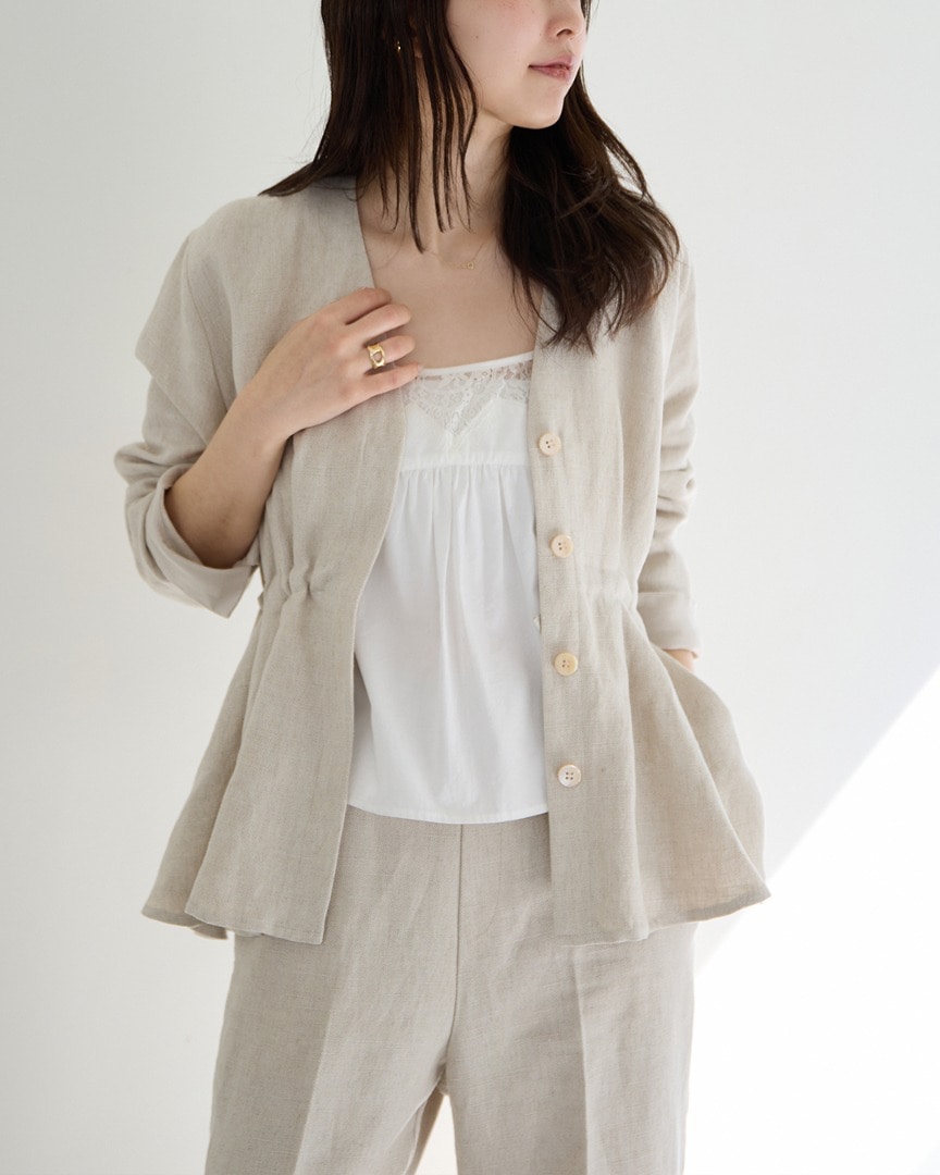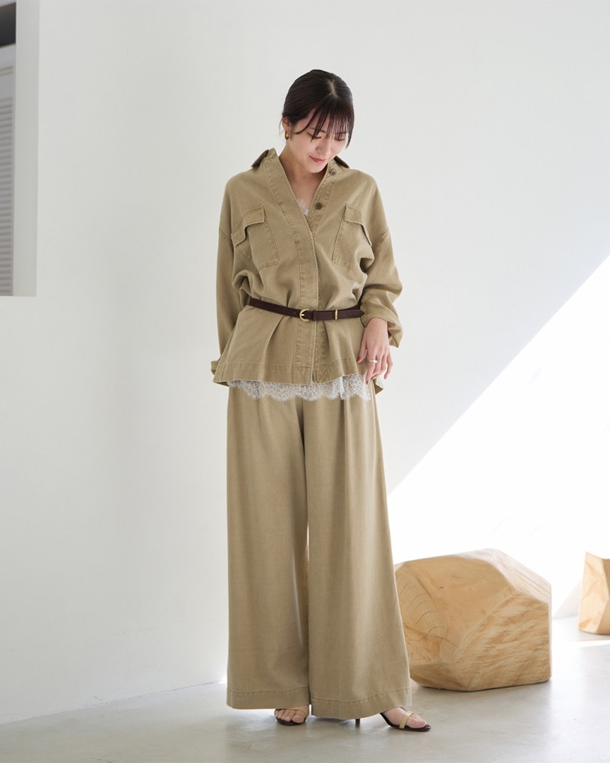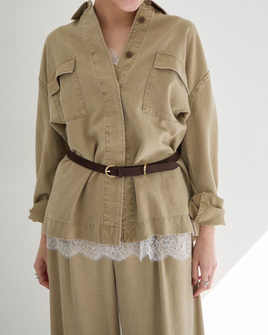 カジュアルな印象のシャツブルゾンはベルトでメリハリをつけ、レースキャミをレイヤードして今年らしいバランスに。