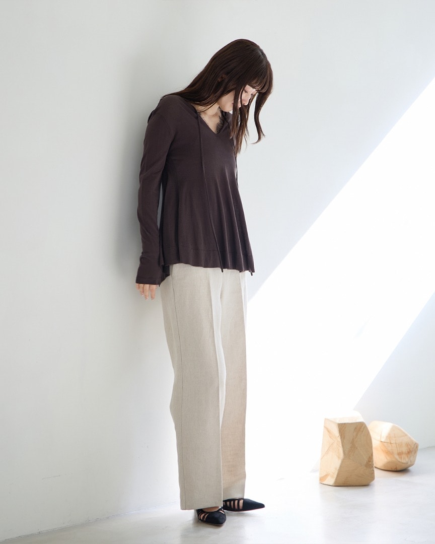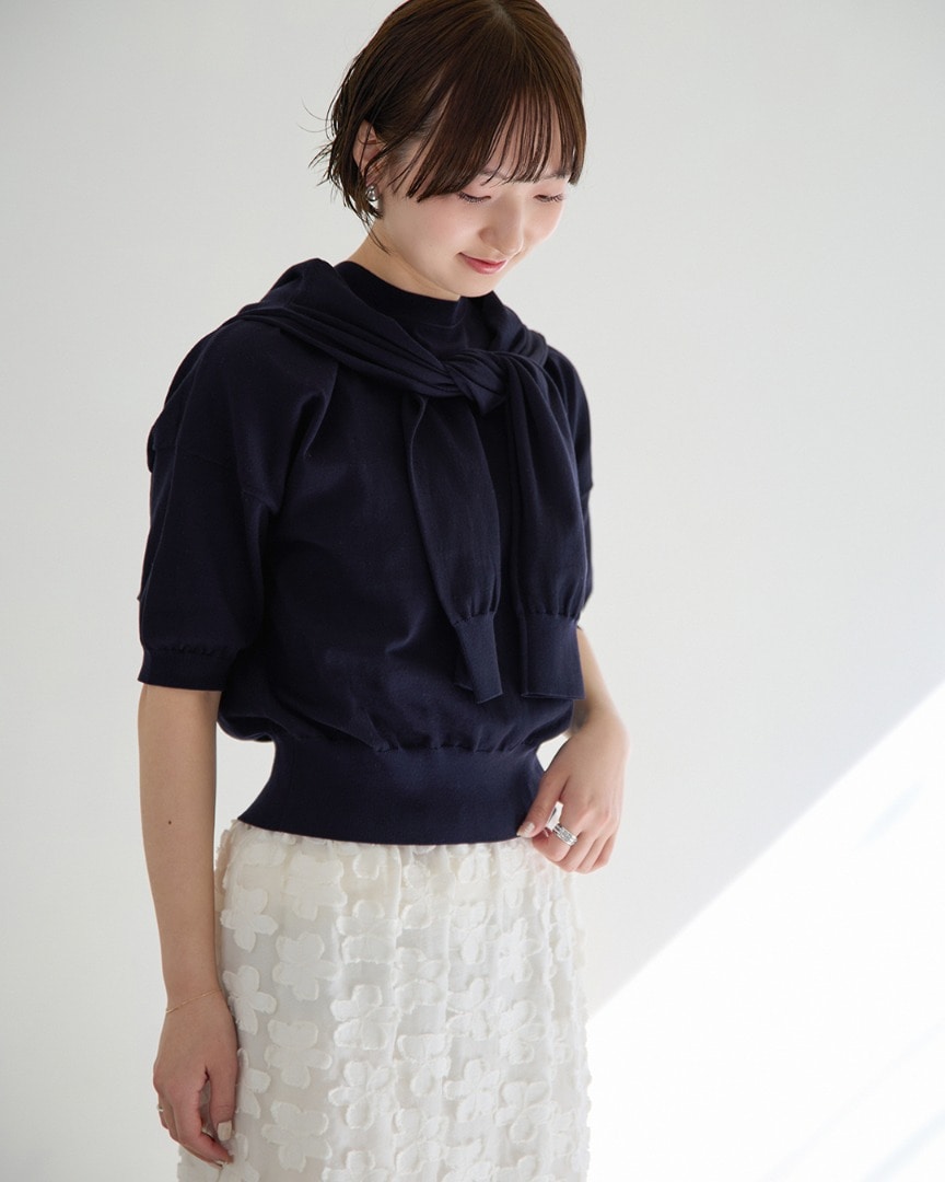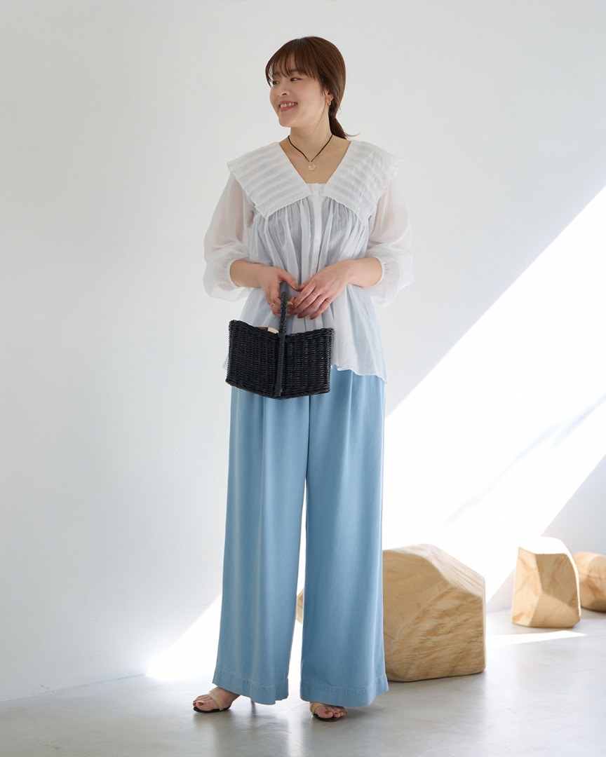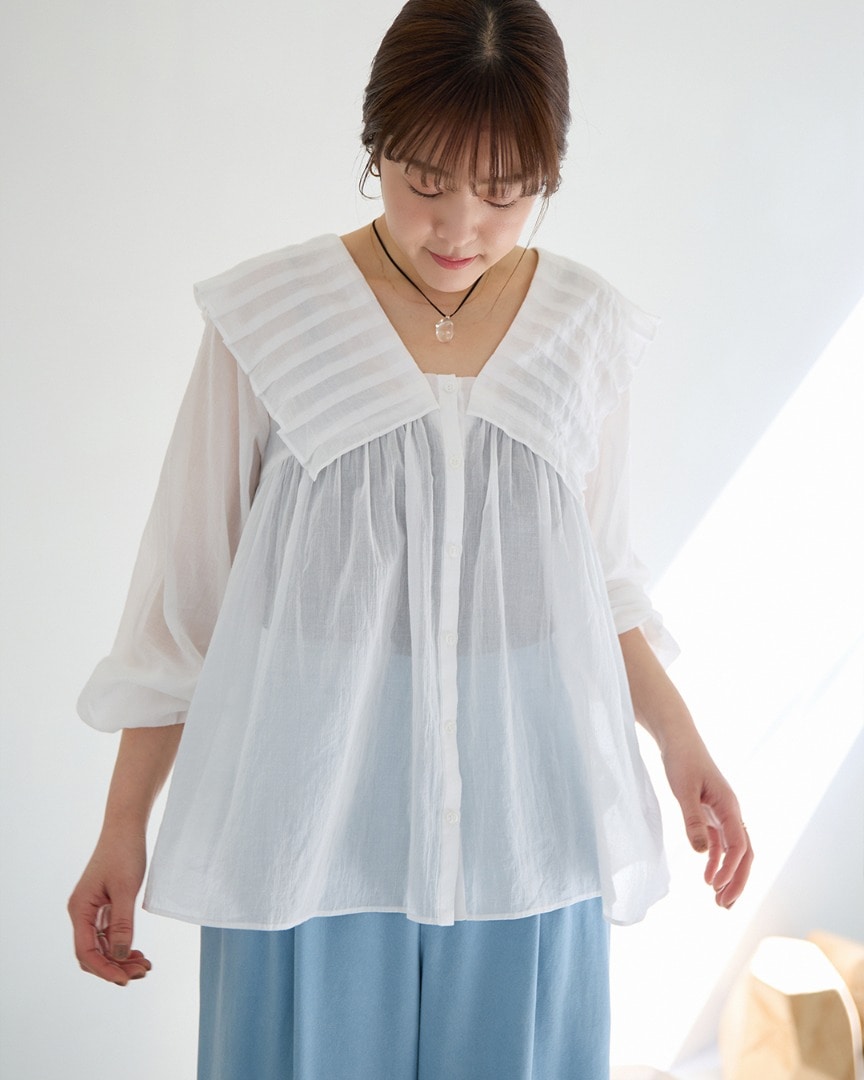 タック+フリルの大きな襟がついたデザインブラウスは1枚で華やかな印象。