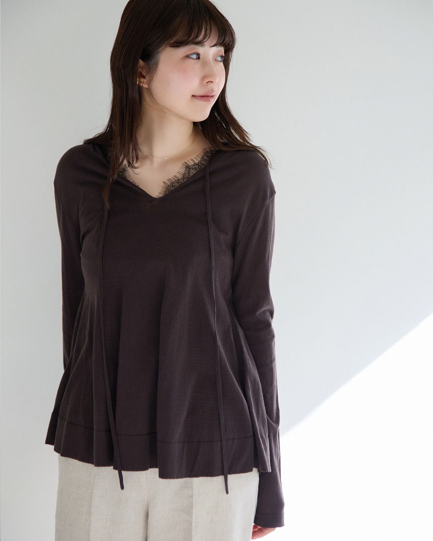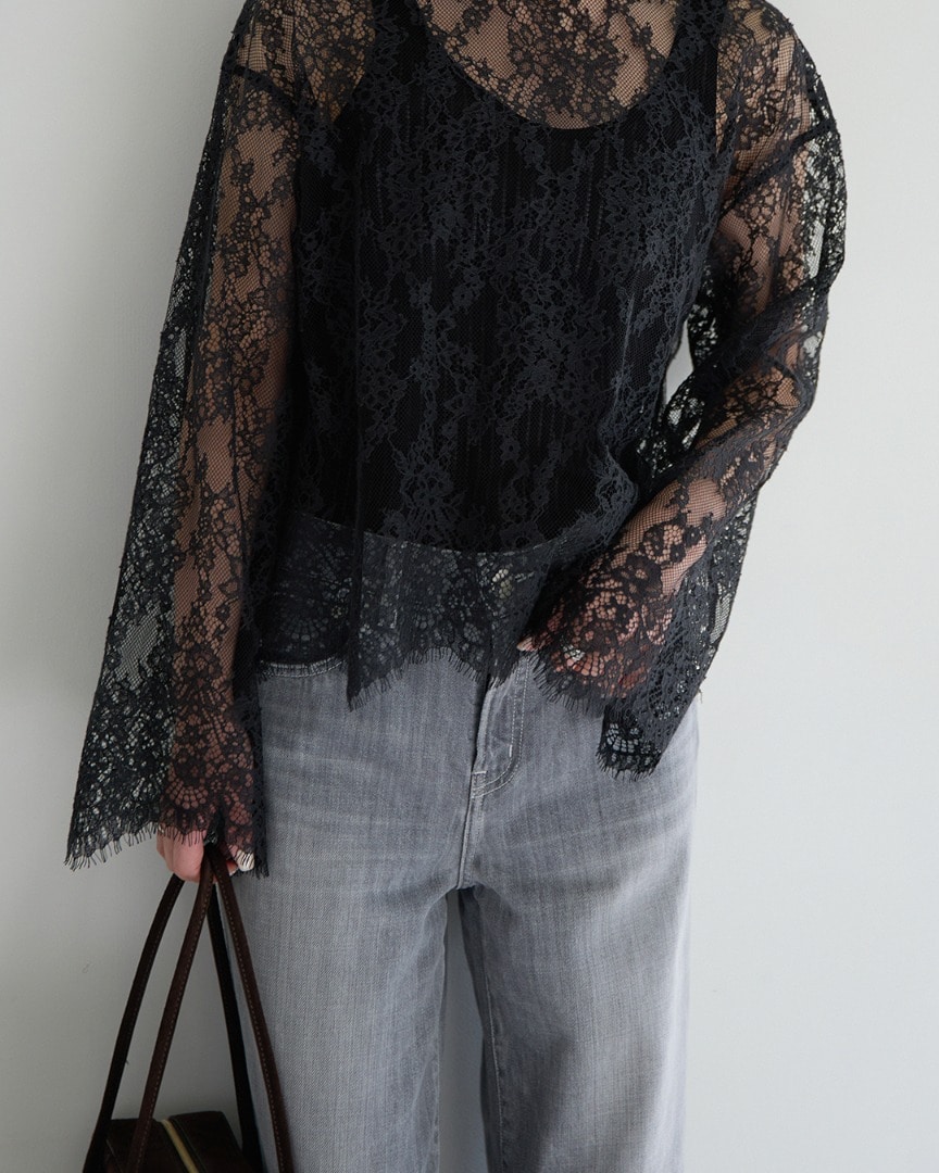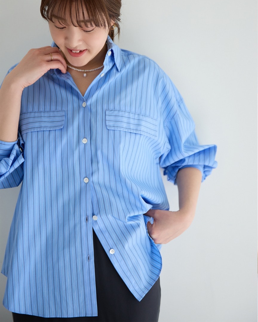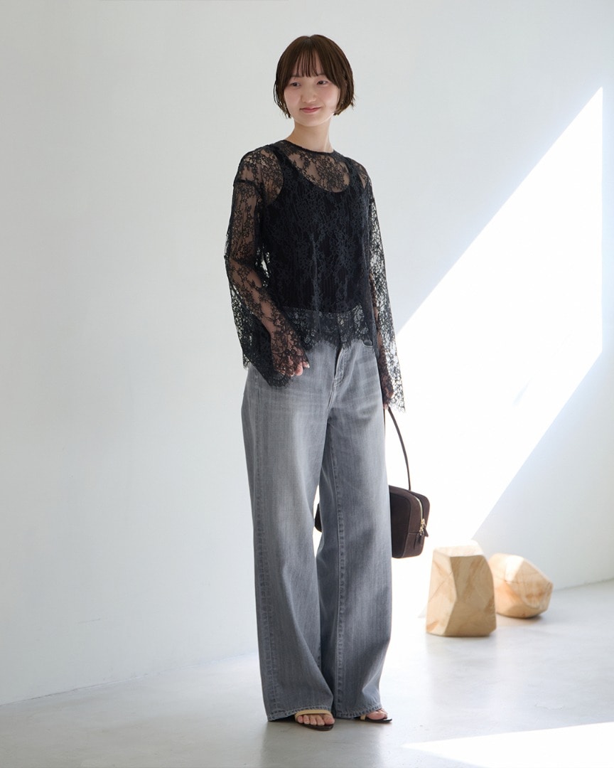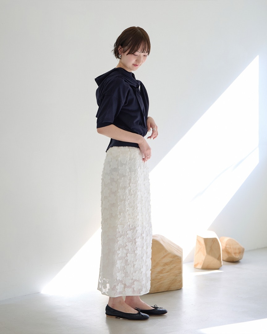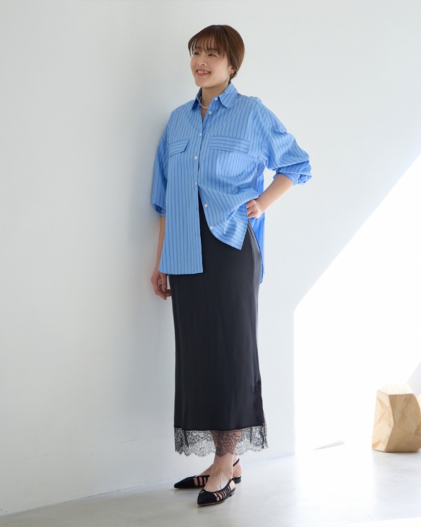 オーバーサイズのパジャマシャツは、センシュアルなレーススカートで抜け感をプラス。