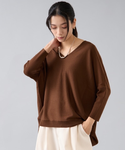 また、Liesseといえばニットというイメージを持ってくださる方も多く、中でもロングセラーのアテムは「VネックBIGプルオーバー」です。人気の秘訣は、1枚でこなれたシルエットになり、体型カバーを叶えて、着回し力が抜群なところ。身ごろはゆったりとしていますが、リブできゅっと絞ったお袖と、前後に浅く開いたVネックデザインが人気を集めています。 様々な素材やカラー展開でずっと愛されている定番ニットです。