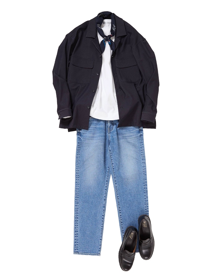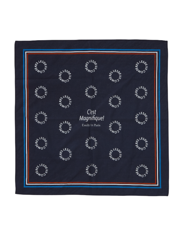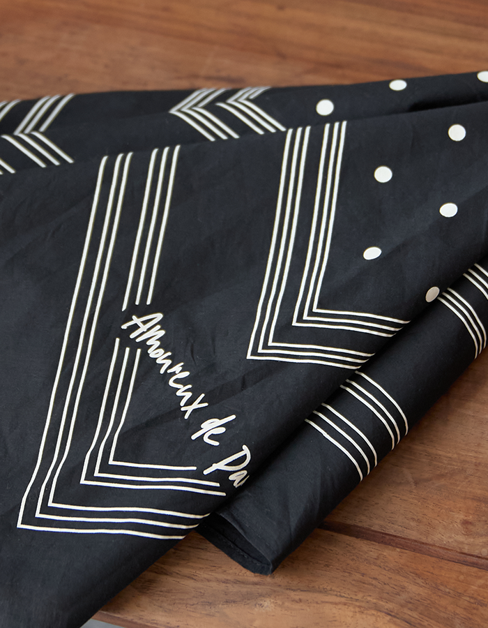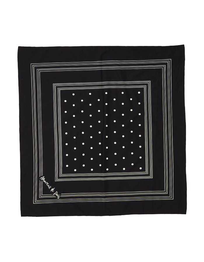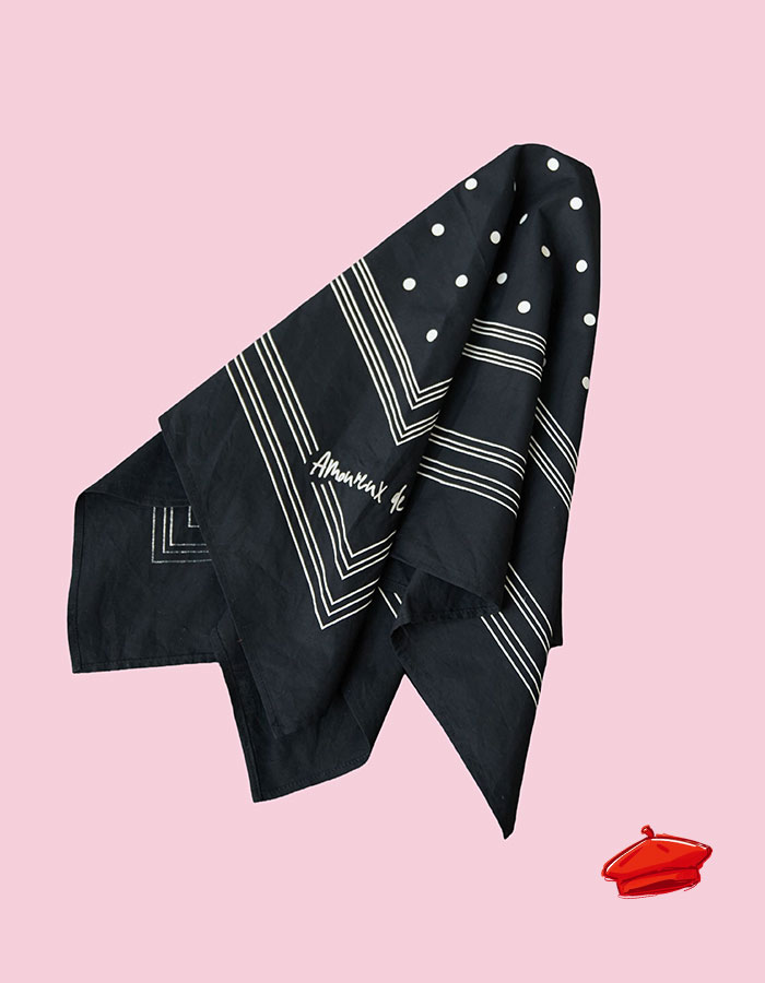 フレンチシックなカラーリングで仕上げた大人が取り入れやすいデザインのバンダナはいつものコーディネートに添えるだけでパリジャンに。