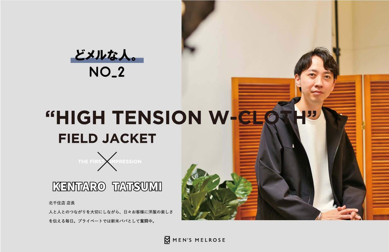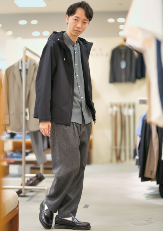 続いてタツミさんにご着用頂きますのは『ハイテンションダブルクロス』を使ったフィールドパーカー。 加えてセットアップでも着用可能な同素材のボトムスです。 クールでスタイリッシュな雰囲気のアイテムですがタツミさんの反応はいかに。