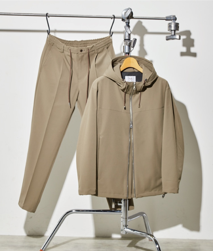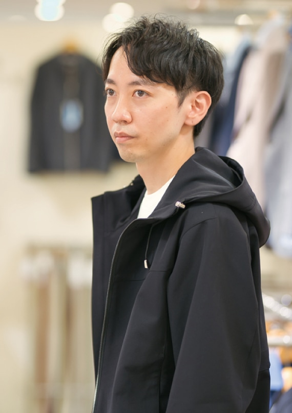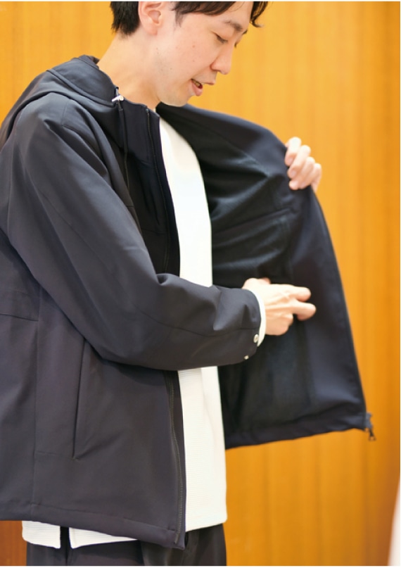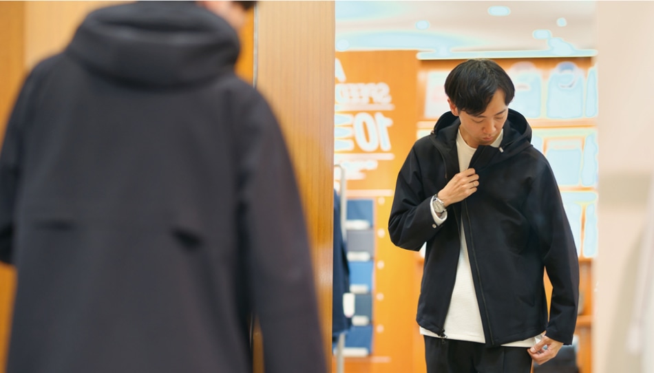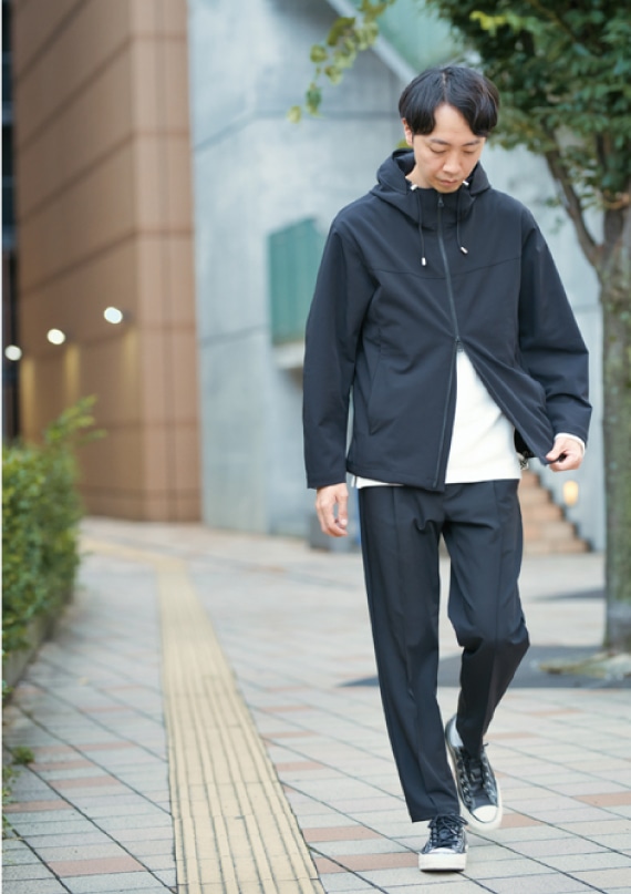 まず素材的には冒頭にお話ししたように高級感がありますので、パーカーという多くの方がコーディネートしやすいアイテムを考えた時に 気軽にスタイリッシュな空気感を出せるのがオススメしやすいポイントですね。 ショート丈の軽いブルゾンは車に良く乗られるお客様にも人気がありますし、スプリットラグランという形状の袖なので 腕まわりの運動性も高くストレッチ性と合わさって非常に楽チンです。 あとはシワになりにくく、付いてしまったシワの回復性も早いので扱いやすさもピカイチですね。