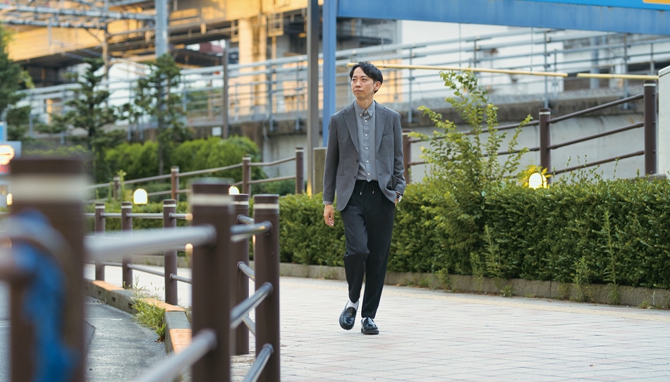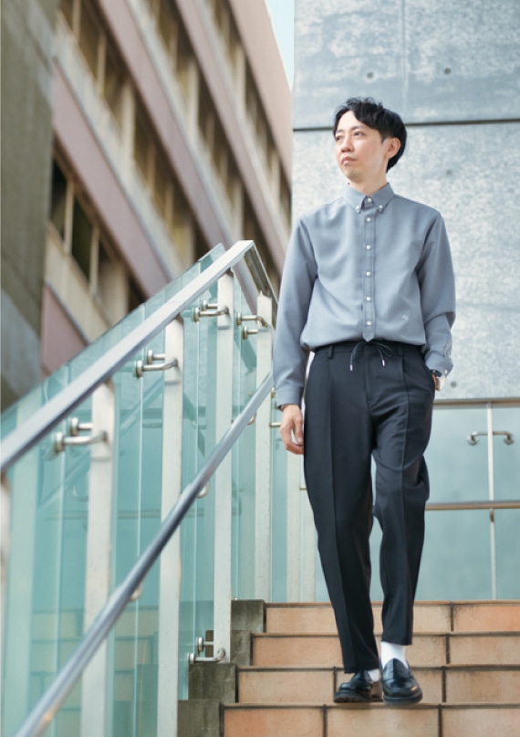 最後にボトムスをビズで使う場合のオススメコーデです。 機能性が詰まったこのボトムスを活かすには、素材特性を前面に出したファンクショナルビズスタイルがオススメです。インナーのシャツにはストレッチ、吸水速乾、防シワ、ドライタッチが魅力のポプリンストレッチで作ったB.Dシャツを合わせます。これは同じ機能を持った商品でさきほど紹介したバンドカラーでもOKです。その場合シャツの裾はインせずアウトの方が砕けた感じでバランスが取り易いかも知れません。お好みの衿型とビズとしての許容度でチョイスして頂ければ問題ありません。あとは人気モデルのリランチェブッチャージャケットを羽織れば完成です。このジャケットも軽量で高いストレッチ性と防シワ性に優れ、吸水速乾性も兼ね備えた秀逸なジャケットです。
