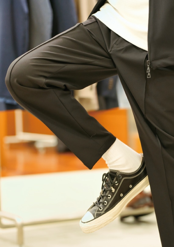 腰回りやわたり部分は適度にゆとりがあるので圧迫感がなくとても穿きやすいですね。 逆に膝や裾の方は結構細くなっているのですが、素材のストレッチがかなり利いているのでストレスが全くありません。 本当にスポーツができるくらいの運動性ですね! ウエストのドローコードが外側でも内側でもしばれる仕様なので、内側に入れてベルトをすればビジネスでも使える仕上がりだと思いました。 センタークリースが消えないクリースステッチ仕様と抜群のストレッチ性、シワになりにくい素材感を考えるとオススメしない理由がありませんね。