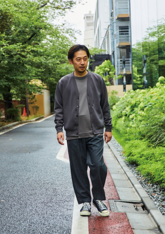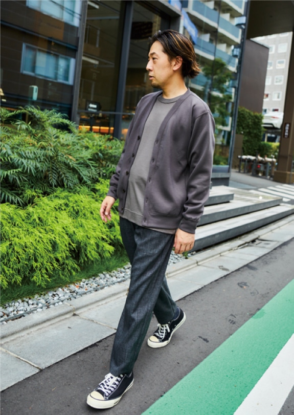 次はカジュアル使いでのオススメコーディネートです。 こちらはシンプルにカーディガンを合わせて清潔感のあるリラックススタイルに仕上げます。 ウールの質感とソフトで落ち感のあるメルローズのダンボールニットの素材感は、 とても相性が良くオススメの組み合わせです。 ボトムスもリラックス感を演出できるワイドタイプのトラウザースを合わせれば、大人っぽくて品のあるリラックスコーデが完成します。