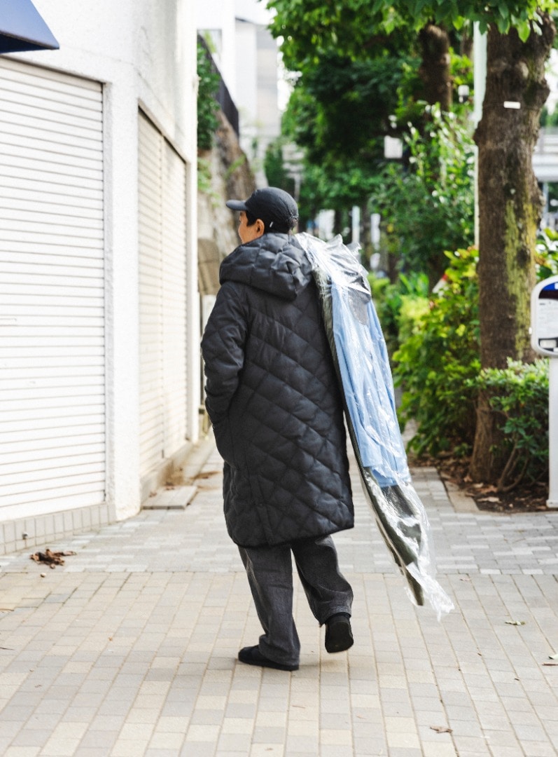 スタイリストの豊島さんが着こなしてくれた「ダウンコート」は、ゆったりとしたシルエットと大きめのフードが特徴。ちょうど今年はコートの気分だったと話す豊島さんは、この「ダウンコート」のどんなところを気に入ったのでしょう。そして、スタイリングのポイントも教えてもらいました。