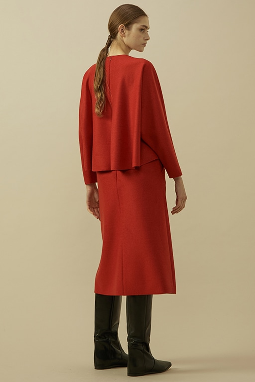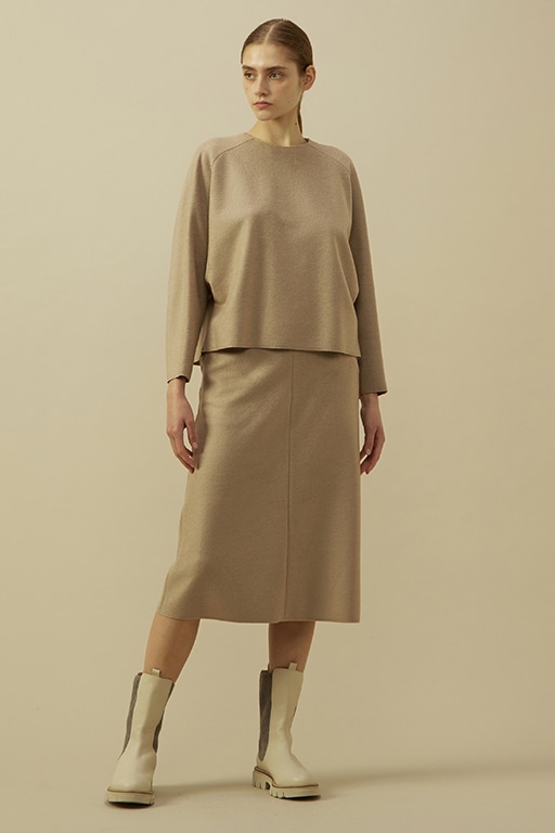 すっきりとしたシルエットでミニマルなプルオーバーとスカート。