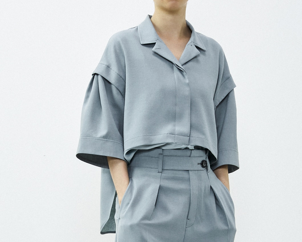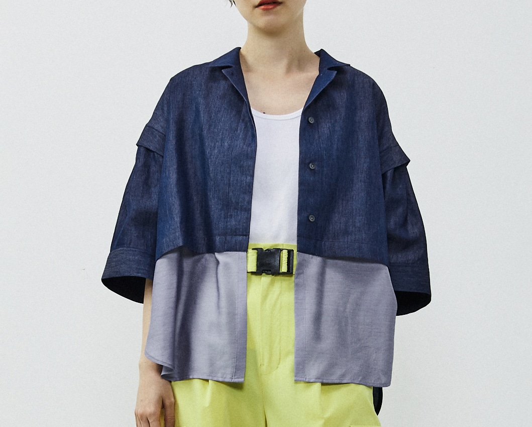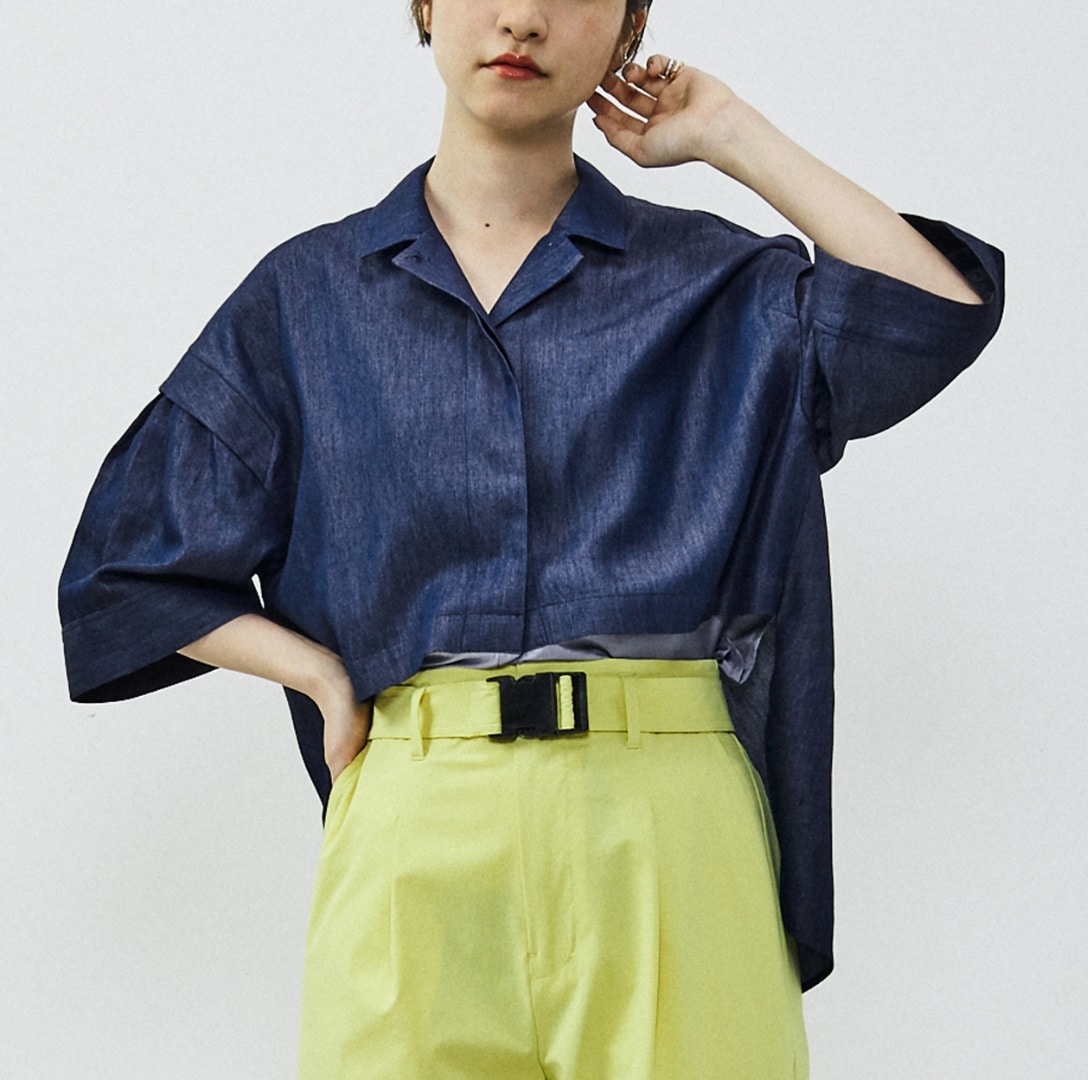 夏に羽織としても使える開衿シャツになります。FP518/FA519と同素材なのでセットアップにもできるシャツです。ボリュームのある袖感と、前身の異素材使いがポイントです。前身の異素材部分をウエストINすることで、クロップド丈のシャツを着てる雰囲気も作れる素敵シャツです。脇の深めスリットで後だけはウエストINしないことも出来ます。