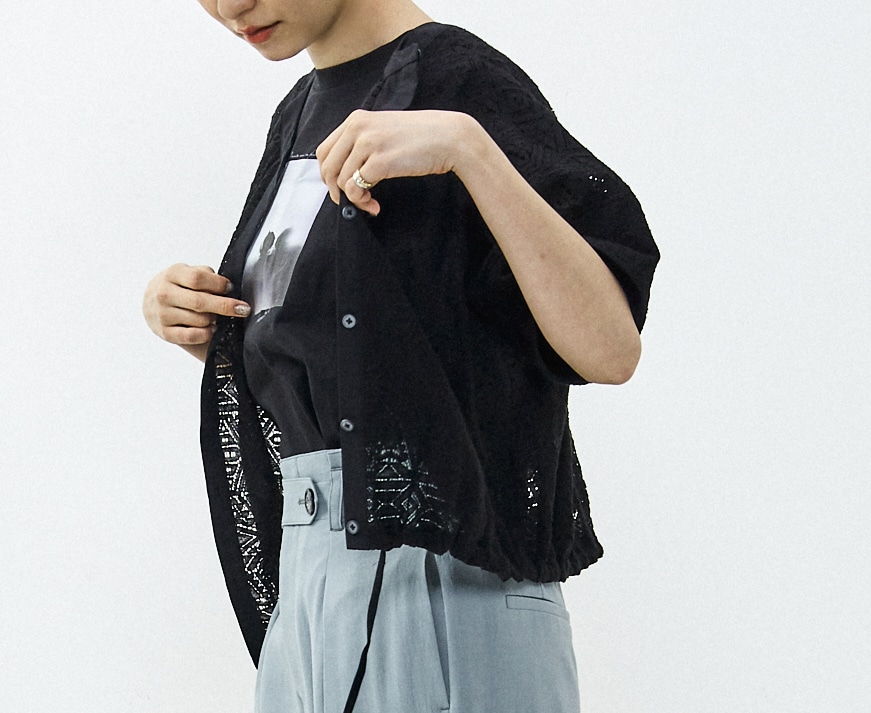 ドルマンの丸みのある袖感が素敵な使いやすい2WAYブラウスです。トレンドのレースと爽やかなストライプの2素材で、どちらも夏に涼しく着れる素材です。レースは大人でも着れる程よい肌見えで、甘くなり過ぎない柄です。ストライプは合繊で少しだけシアー感のある軽やかな素材です。後はあきになっていて、そちらを前にすれば羽織としても使えます。裾のヒモを絞って、自分に合わせたシルエットに調整できます。