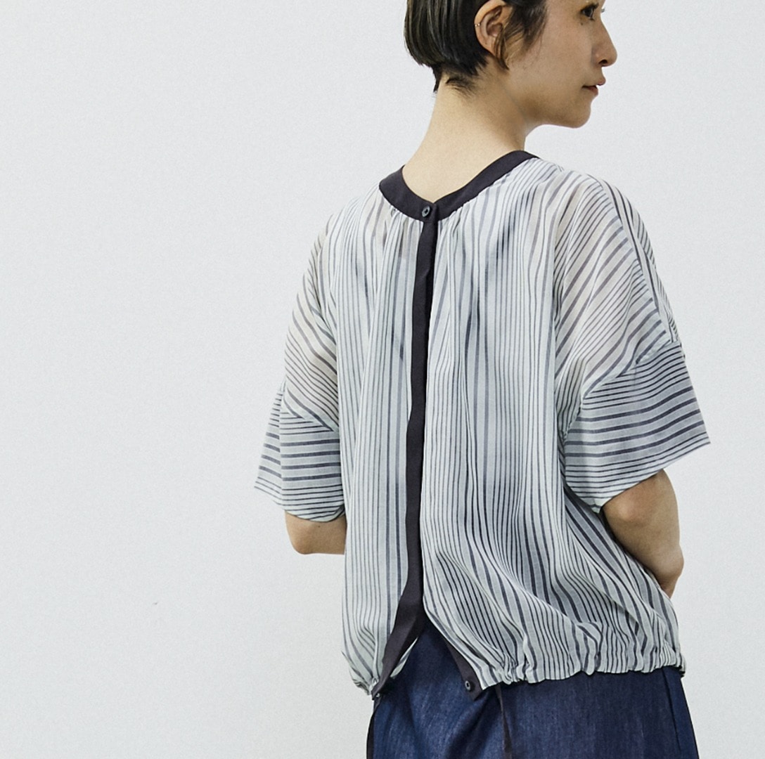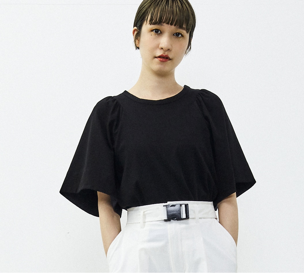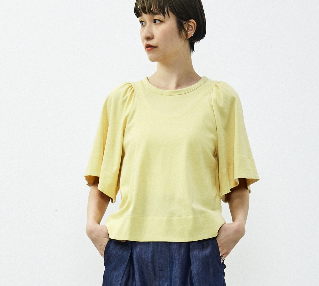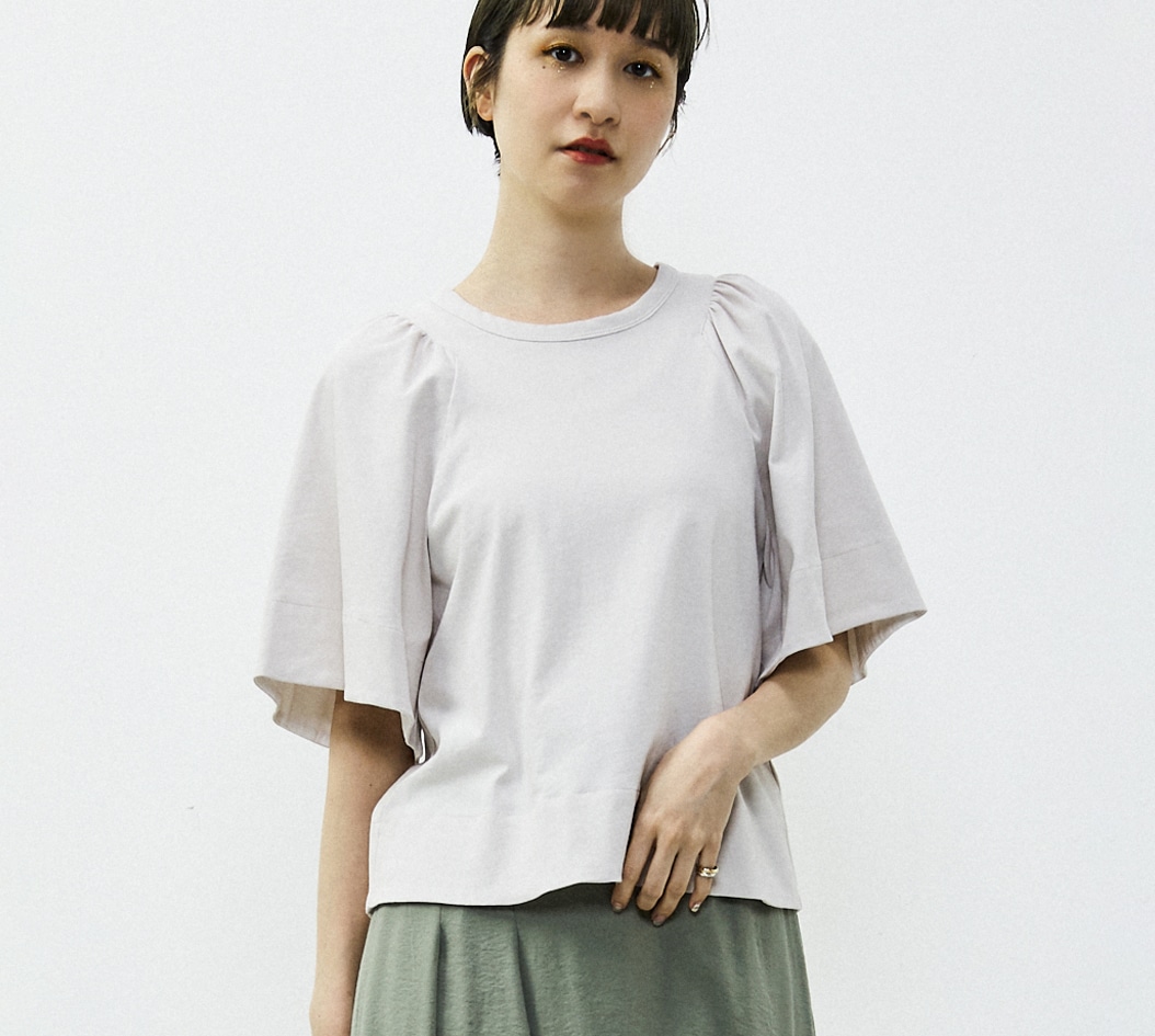 フレアーの袖が素敵な使いやすい夏のカットソーになります。衿ぐりのギャザーとそこから広がるフレアー袖のボリュームが素敵。今年らしい短めの丈感で、ウエストINしなくても鮮度感あるバランスで着れます。袖口や裾の裏にさりげなく使った異素材がポイントです。透けないしっかりした素材ですが、シャリ感のあるので夏でも涼しく着れるカットソーです。