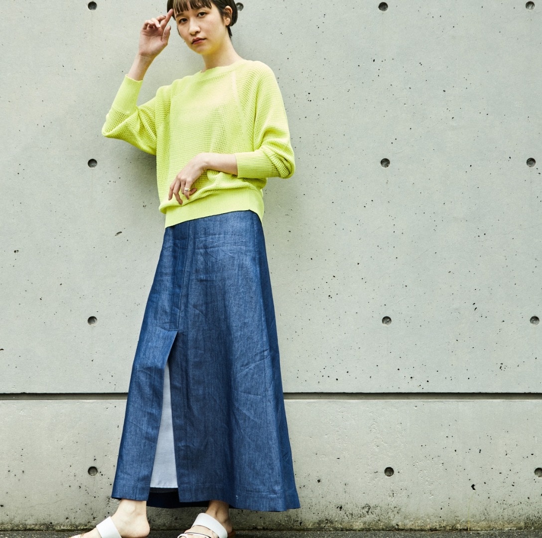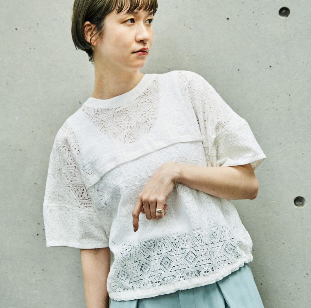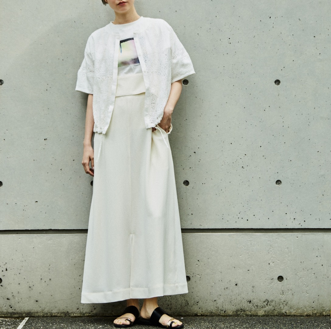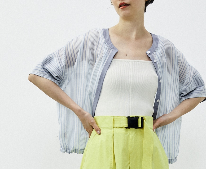 フレアーの袖が素敵な使いやすい夏のカットソーになります。衿ぐりのギャザーとそこから広がるフレアー袖のボリュームが素敵。今年らしい短めの丈感で、ウエストINしなくても鮮度感あるバランスで着れます。袖口や裾の裏にさりげなく使った異素材がポイントです。透けないしっかりした素材ですが、シャリ感のあるので夏でも涼しく着れるカットソーです。
