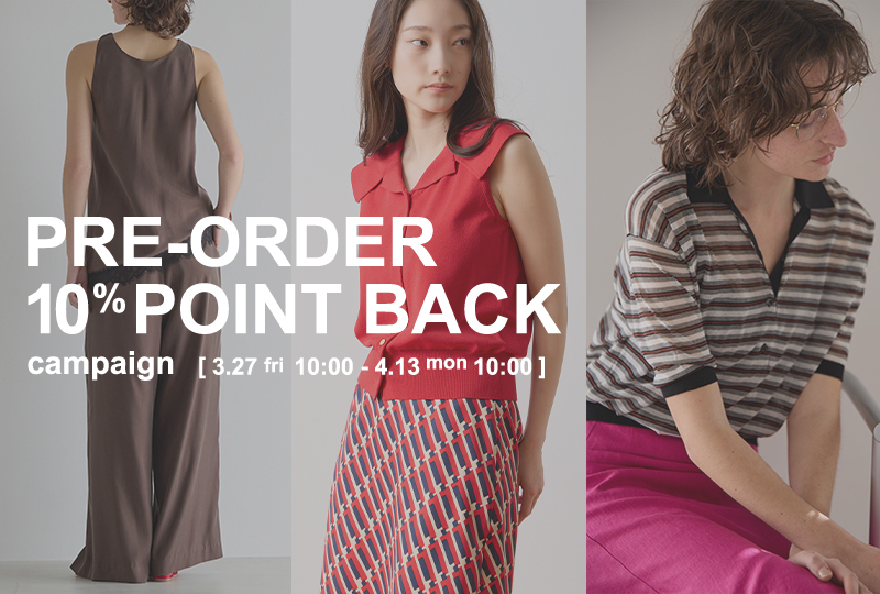 2026.03.27 予約商品ご購入で10%ポイント還元 今なら予約商品購入で10%ポイント還元! 期間: 4/13(月)10:00まで 対象:予約商品 上記期間内に予約商品をお買上いただくと、10%ポイント還元!初夏の先行予約アイテムをぜひご覧ください。※会員クラスに関わらず全てのお客様10%ポイント還元となります。※付与予定ポイントはログイン後カート内にてご確認いただけます※所持ポイントはマイページからご覧頂けます。ポイント付与はご注文商品の発送が完了した約3日後に、仮ポイントが「確定ポイント」の状態になります。ポイントは確定後にご利用いただけます。▶【予約商品一覧】