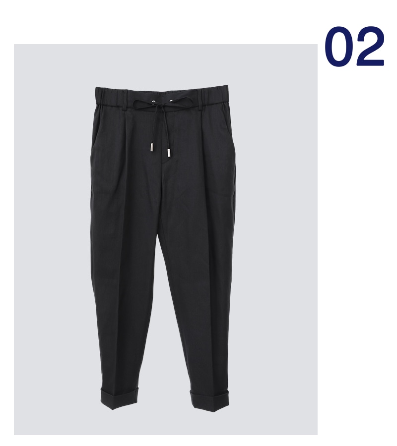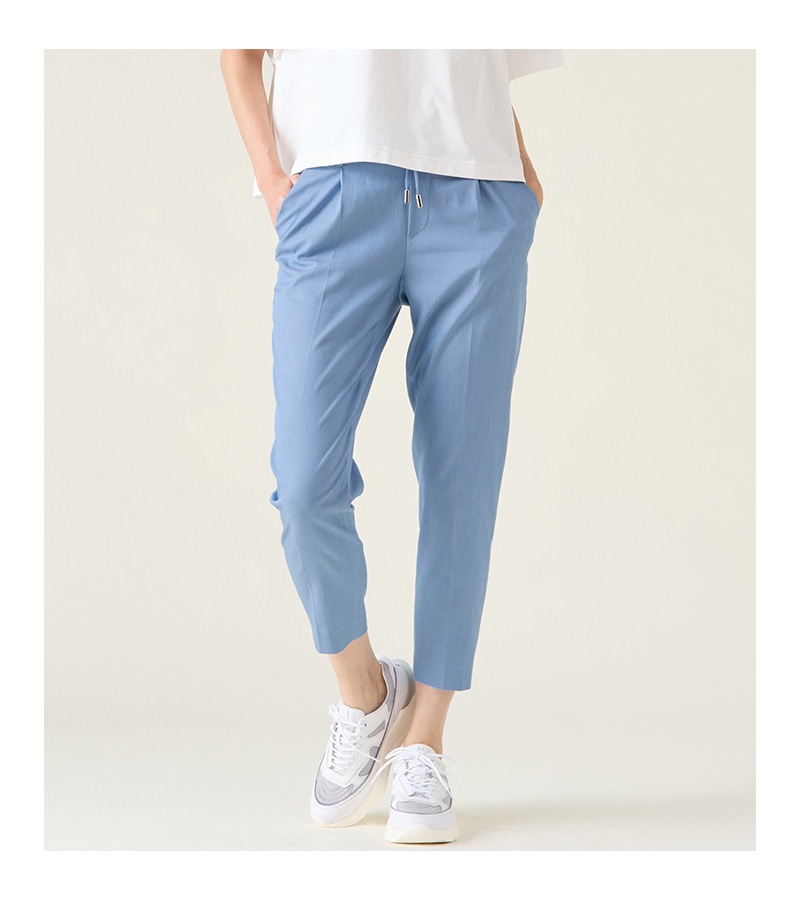 ストレッチのきいたリネン混の涼し気な素材使いです。