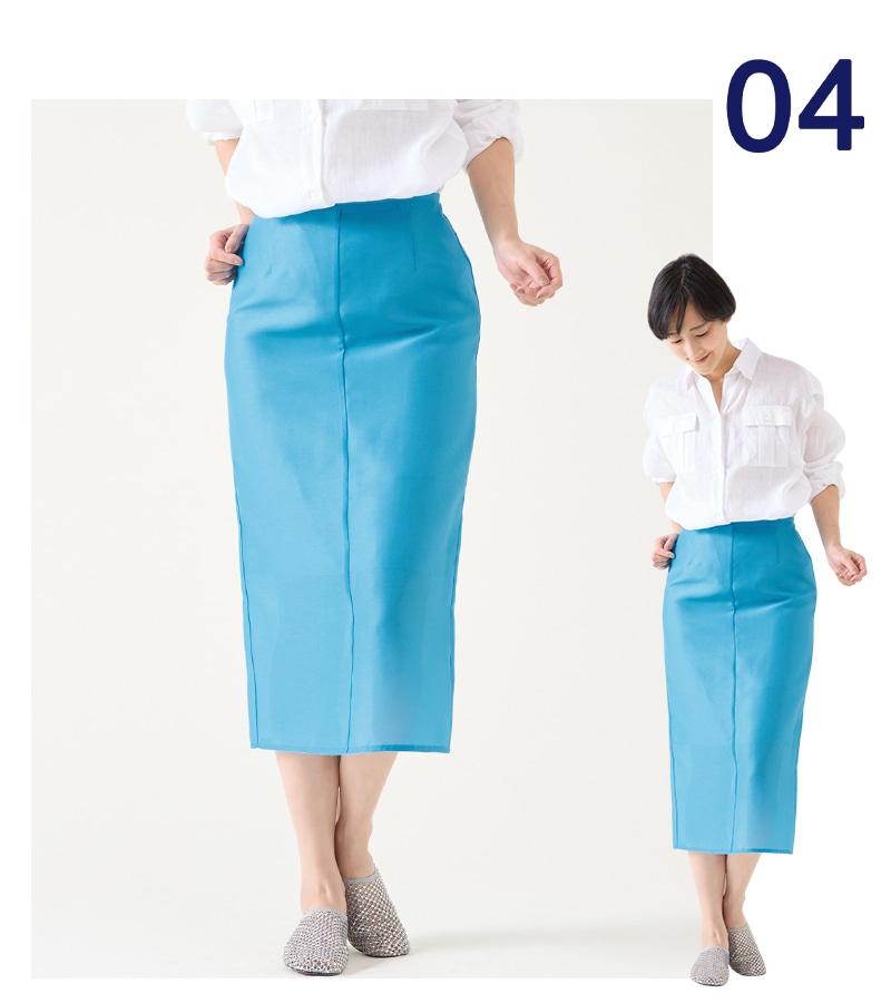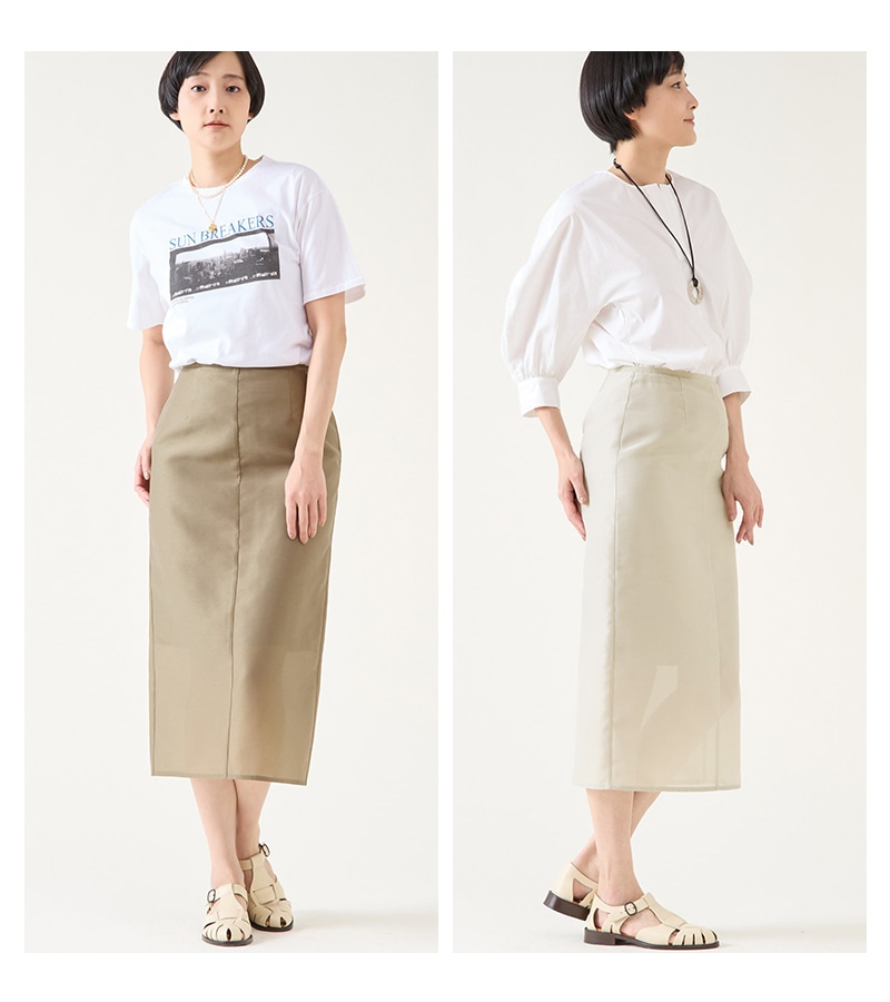 腰回りからストンと落ちるシルエットの透け素材のナロースカート。