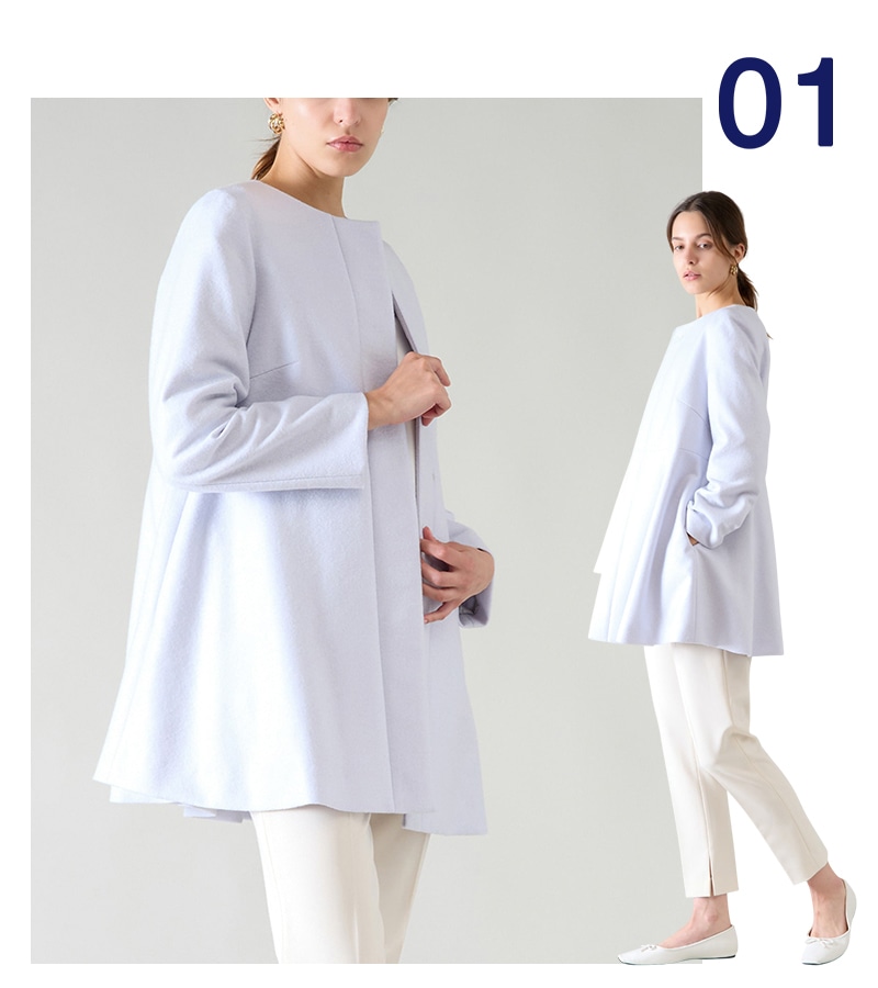 ウエスト下からのフレア切り替えでシルエットを作ったハーフ丈のペプラムコート。