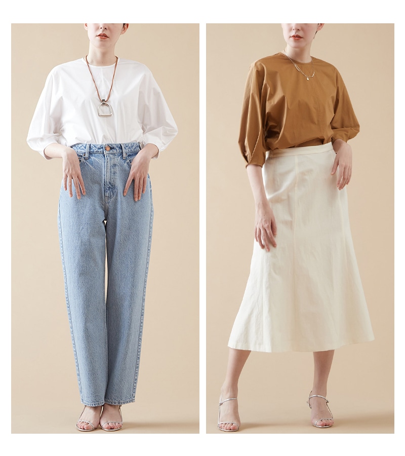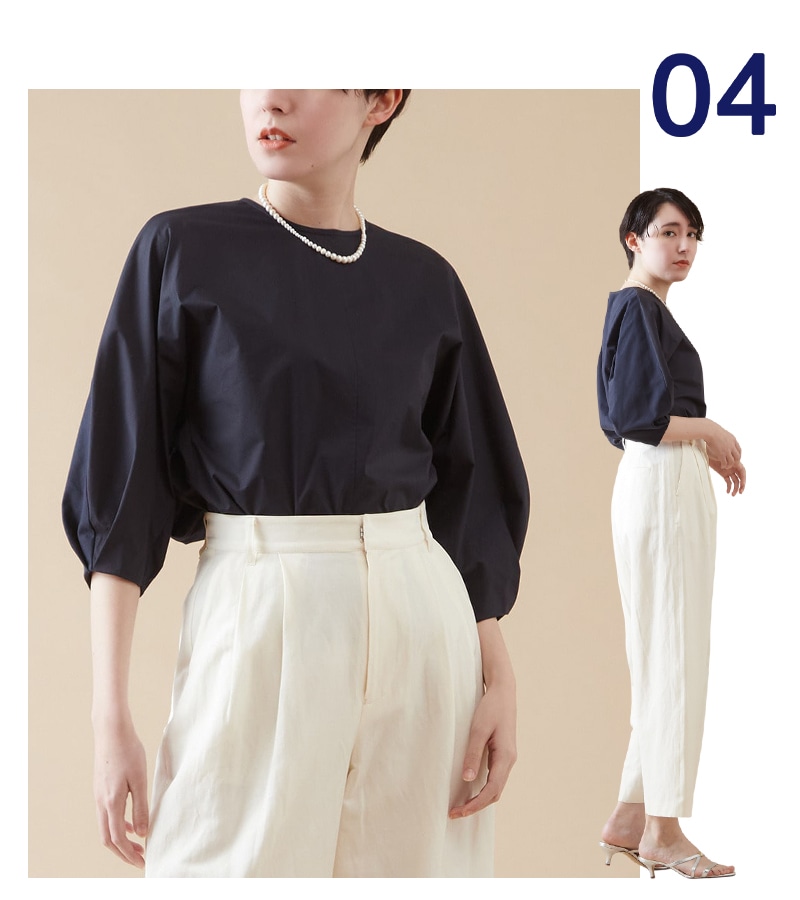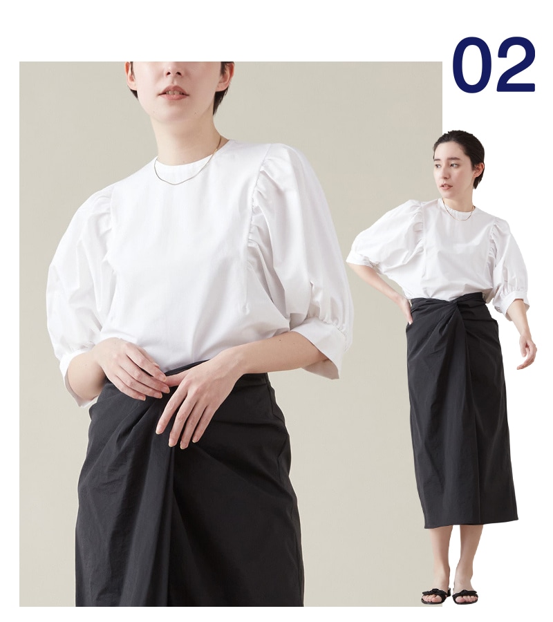 大人が着やすいパフスリーブで、ブラウス感覚で一枚着として着用がおすすめです。