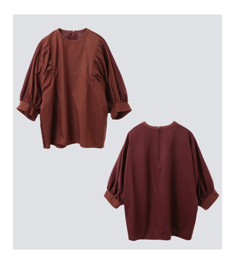 タック&ギャザーで華やかながら、ドルマンスリーブでモードな印象にしています。