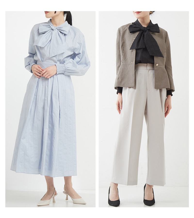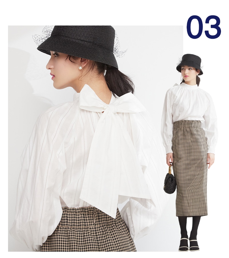大胆なリボンをアクセントにシンプルなボトムとのコーディネートがおすすめ。