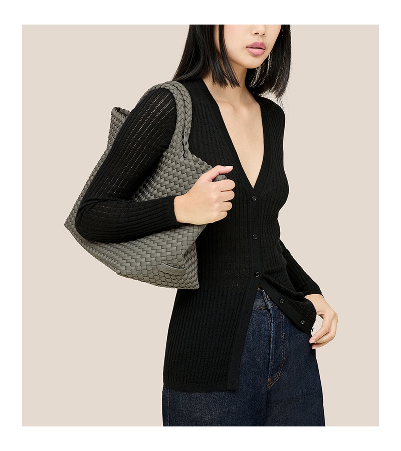 サステイナブルに努め長持ちし、クリーニングや手入れが簡単なネオプレーン素材を巻いて織る独自の製法で作られ、軽量で汚れにくく、防水性に優れています。