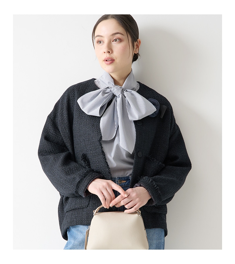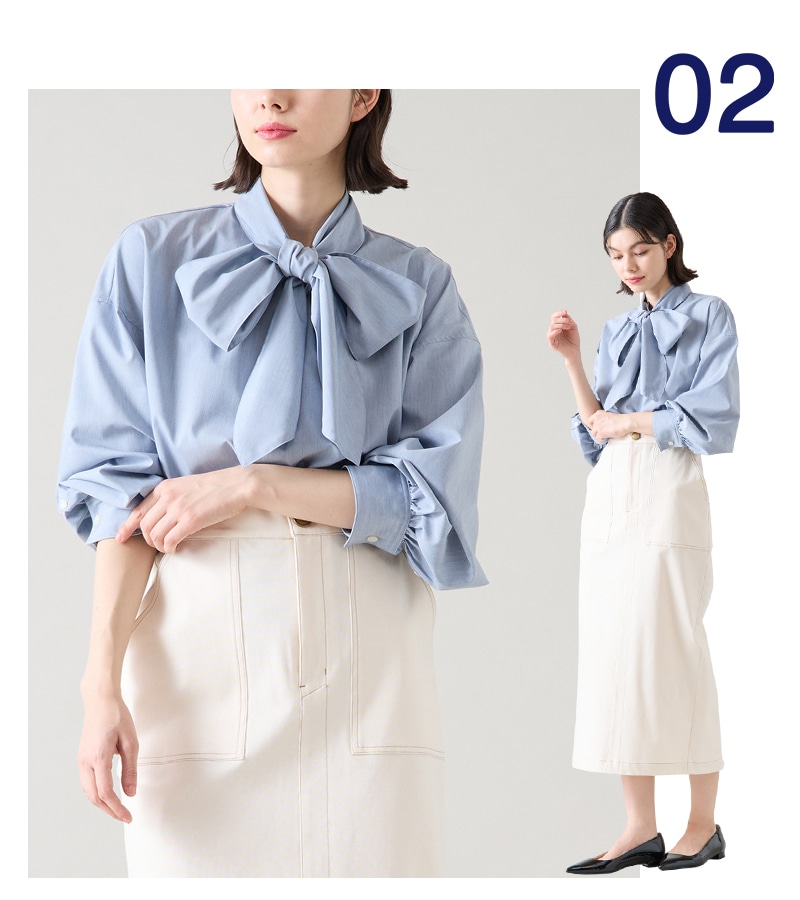 シャツ素材ならではのリボンのボリュームが目を惹きます。