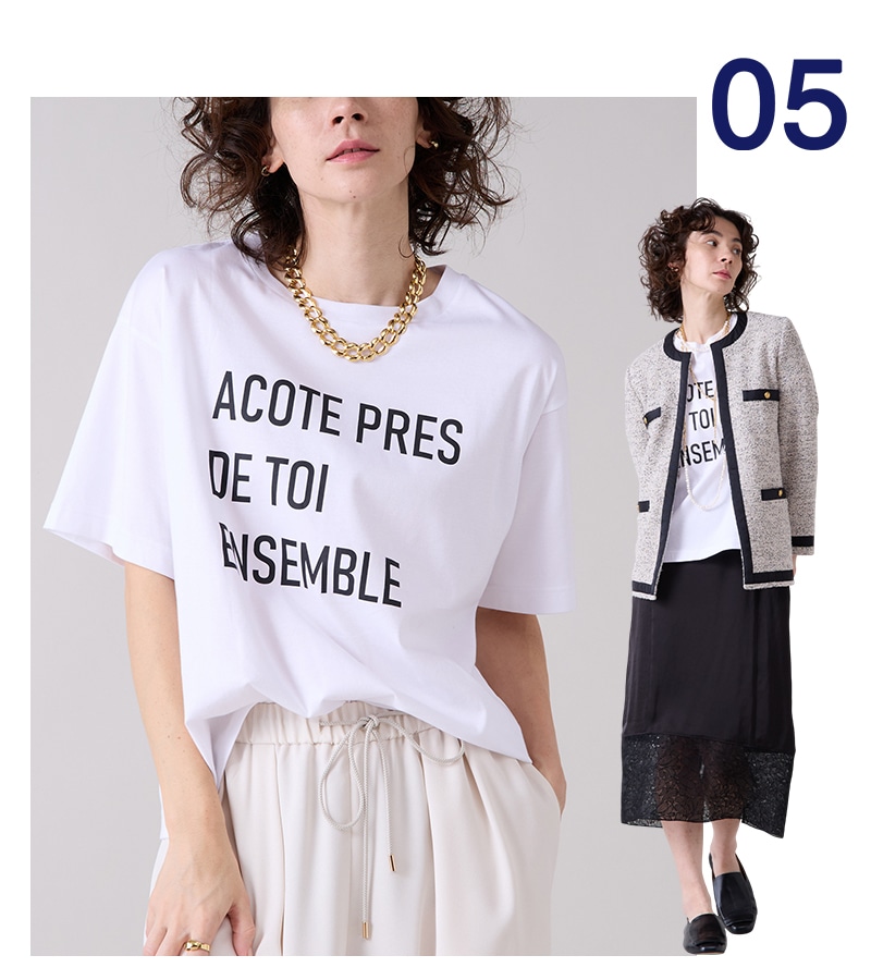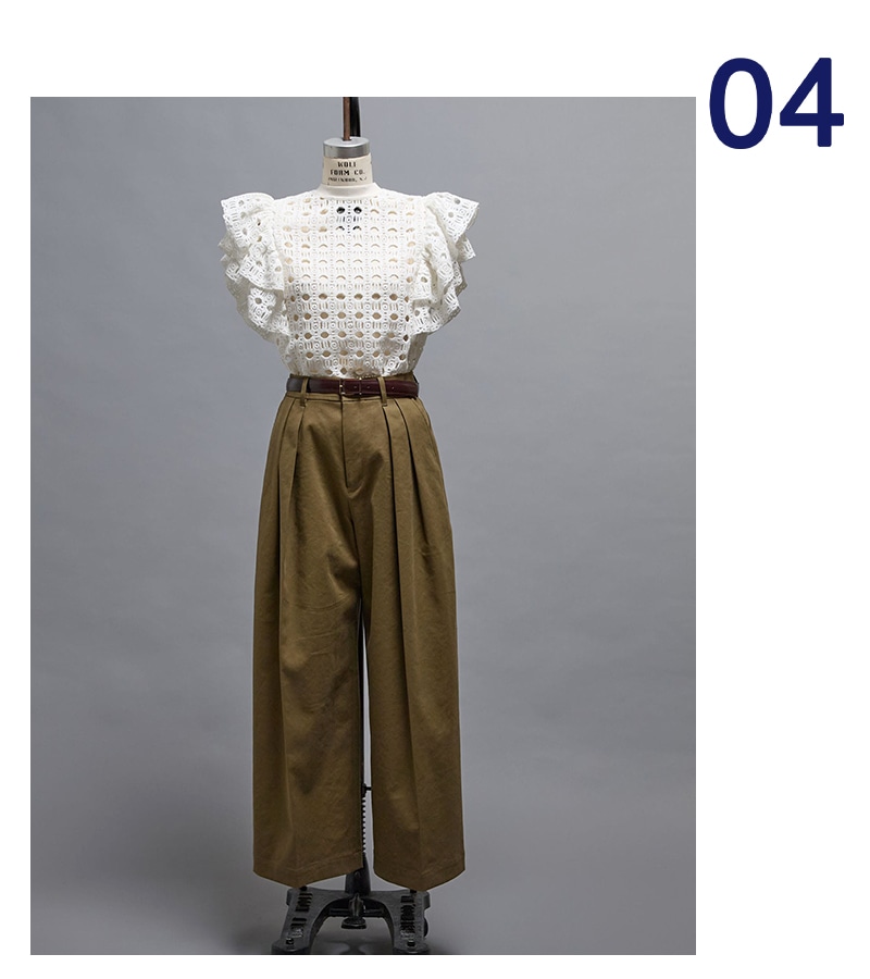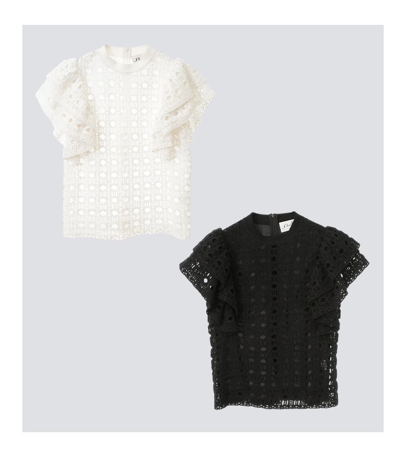クロッシェ風のエンブロイダリーレースが大胆でインパクトのある柄で、2段フリルも甘くならず、大人なトップスに。